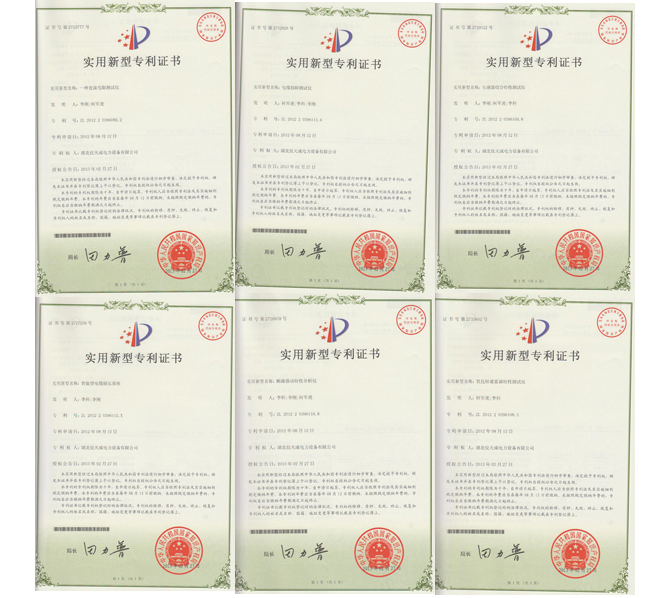 2013年2月,湖北儀天成電力設(shè)備有限公司自主研發(fā)的直流電阻測(cè)試儀、互感器綜合特性測(cè)試儀、電纜故障測(cè)試儀、智能型電纜耐壓系統(tǒng)、斷路器動(dòng)特性分析儀、氧化鋅避雷器特性分析儀共6種產(chǎn)品再榮獲國(guó)家知識(shí)產(chǎn)權(quán)局頒發(fā)的實(shí)用新型專利證書(shū)。