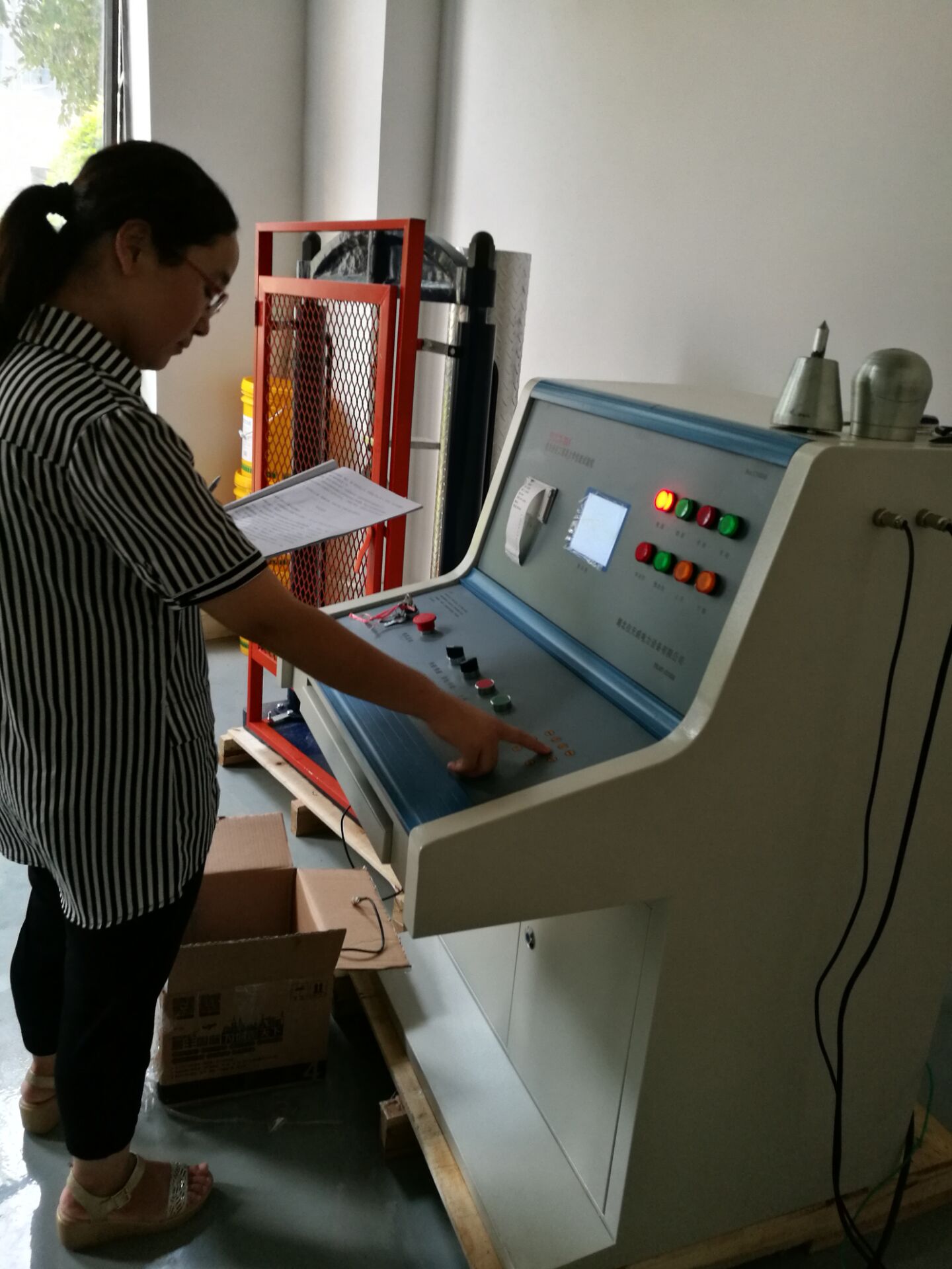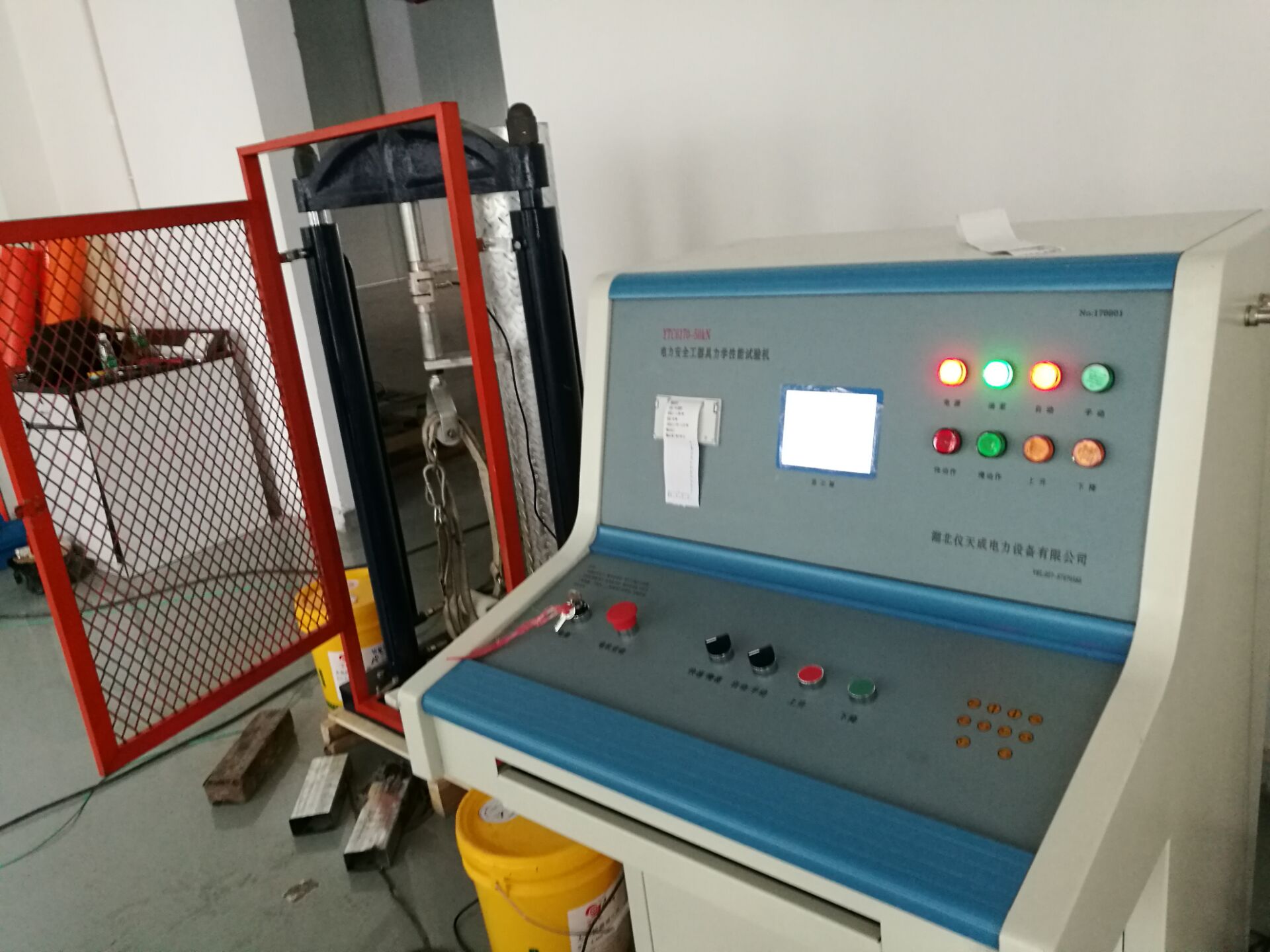 此次培訓的重點設備是YTC6170電力安全工具器具力學性能測試機,我公司研制的電子測力機(電力安全工器具力學性能試驗機),符合國家電力公司《電力安全工器具預防性試驗規(guī)程》要求,按《規(guī)程》完成各種預防性力學性能試驗。本機由測試顯示和加力設備兩部分組成(如需測安全帽配安全帽試驗臺) 測試顯示部分由拉壓力傳感器、控制鍵盤、液晶顯示屏、微型打印機、手動按扭等組成。鍵盤使用薄膜輕觸鍵,使用手感好,液晶顯示為中文菜單式,操作人員可根據(jù)被試對象選擇相應名稱菜單,當需要對測試結(jié)果打印時,可打印測試報告,便于備案檢查。本機設置兩個傳感器接口,傳感器3KN、100KN傳感器為測試安全工具之用。安全帽測試為測試安全帽專用。兩只傳感器既可單獨使用,也可同時使用。能滿足不同使用場所環(huán)境的要求和工作要求,性能穩(wěn)定,測試結(jié)果準確。