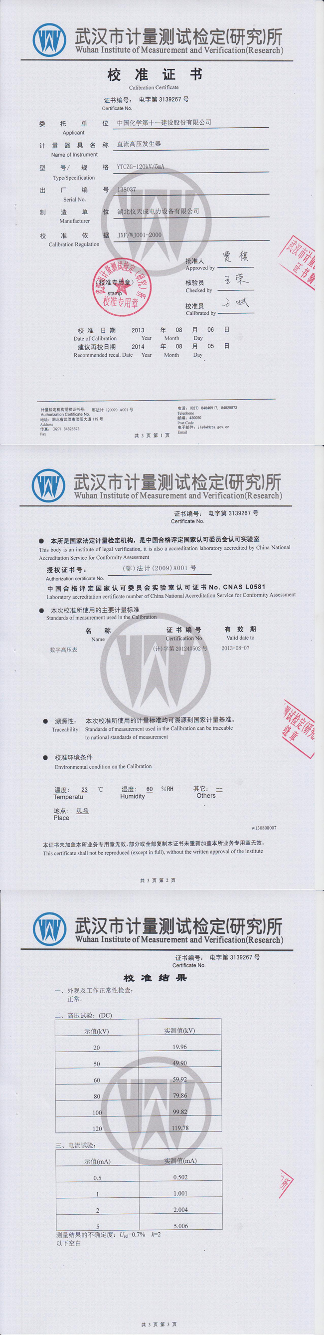 轉(zhuǎn)載:"YTCZG-120kV/2mA直流高壓發(fā)生器資質(zhì)證書" 請注明來源于儀天成電力。 更多技術(shù)問題請致電儀天成電力客戶服務:027-87876585,技術(shù)部專線:027-87876585,在線客服:719388481